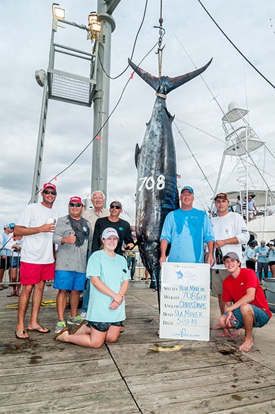 At 5:27 pm, Capt. Devin Potts started to back S__e__a Mixer into the scales with a blue marlin. Angler Chris Davis and the entire _Sea Mixer _crew started jumping for joy when weigh master Joe Yurt called out 708.6 pounds to take over the first place blue marlin by only 2.5 pounds.